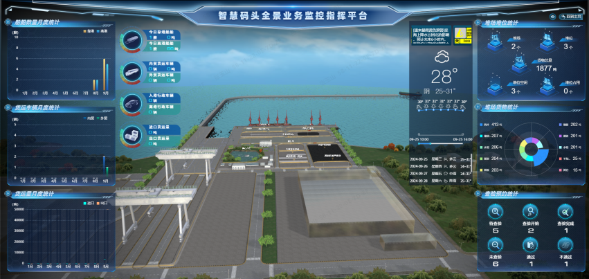 航通智能主要承擔(dān)信息化系統(tǒng)包括海關(guān)、邊檢、海事信息化系統(tǒng)相應(yīng)軟硬件設(shè)施設(shè)備,以及符合海關(guān)監(jiān)管要求和前詹作業(yè)區(qū)通用碼頭業(yè)務(wù)發(fā)展需要的聯(lián)網(wǎng)監(jiān)管平臺及配套系統(tǒng)。公司對標(biāo)全國一流碼頭作業(yè)區(qū)口岸基礎(chǔ)設(shè)施信息化建設(shè)標(biāo)準(zhǔn),充分運(yùn)用物聯(lián)網(wǎng)、大數(shù)據(jù)、人工智能、數(shù)字孿生、3D模型等前沿科技,并引入智慧碼頭全景業(yè)務(wù)指揮監(jiān)控平臺,通過平臺與碼頭作業(yè)系統(tǒng)對接,抽取碼頭內(nèi)外貿(mào)貨物的作業(yè)數(shù)據(jù),結(jié)合可視化智能大數(shù)據(jù)展示功能,實(shí)現(xiàn)獲取船舶抵錨、靠泊離港作業(yè)動(dòng)態(tài),并對內(nèi)外貿(mào)貨物進(jìn)出卡口、堆場存取、裝卸船等實(shí)時(shí)、動(dòng)態(tài)管理和全程監(jiān)控,全面提升碼頭作業(yè)全過程可視化監(jiān)管水平和查驗(yàn)全流程智能化管理。