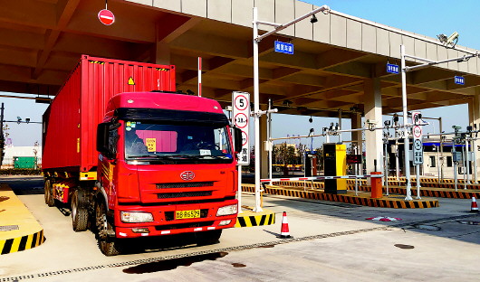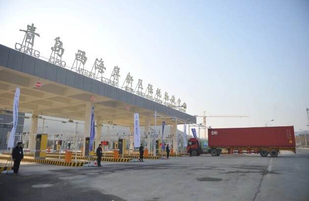 12月18日,在青島西海岸新區(qū)保稅物流中心,貨車司機領(lǐng)取通關(guān)卡。